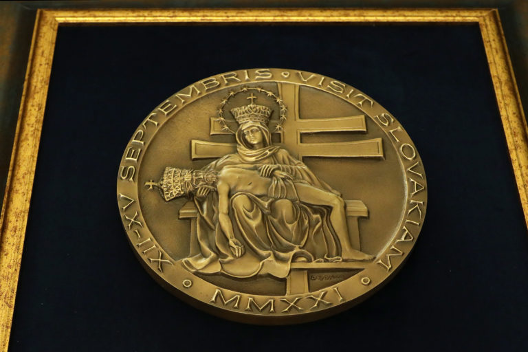 Pápežská medaila, darovaná prezidentke SR od Svätého Otca po spoločnom stretnutí v Prezidentskom paláci. Bratislava, 13. september 2021. Foto: SITA/Kancelária prezidentky SR