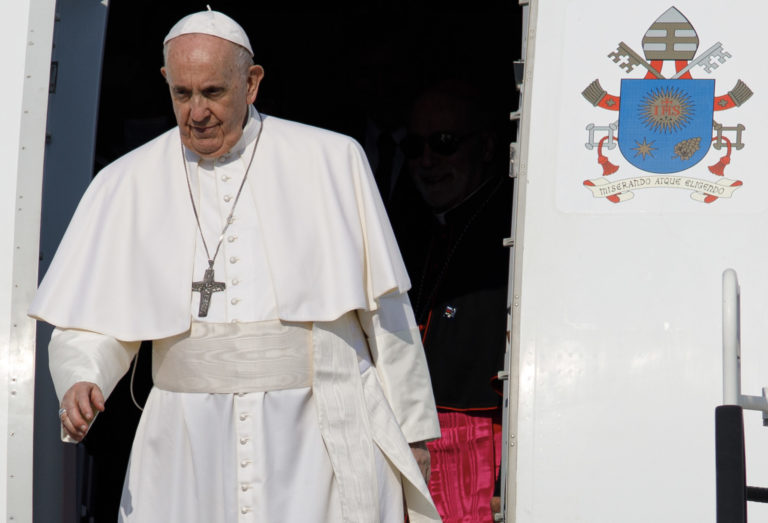 Pápež František vystupuje z lietadla po pristáti na bratislavskom letisku. Bratislava, 12. september 2021. Foto: SITA/AP/Gregorio Borgia