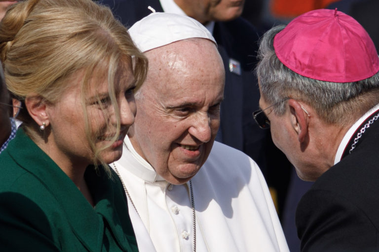 Zľava: Prezidentka SR Zuzana Čaputová, pápež František a bratislavský arcibiskup Stanislav Zvolenský počas oficiálneho prijatia pápeža na bratislavskom letisku. Bratislava, 12. september 2021. Foto: SITA/Branislav Bibel