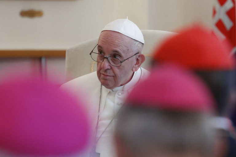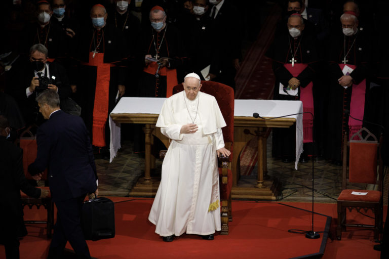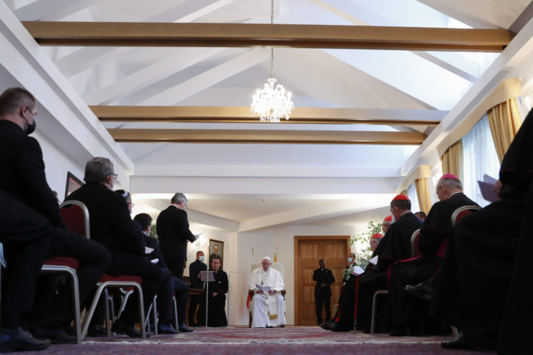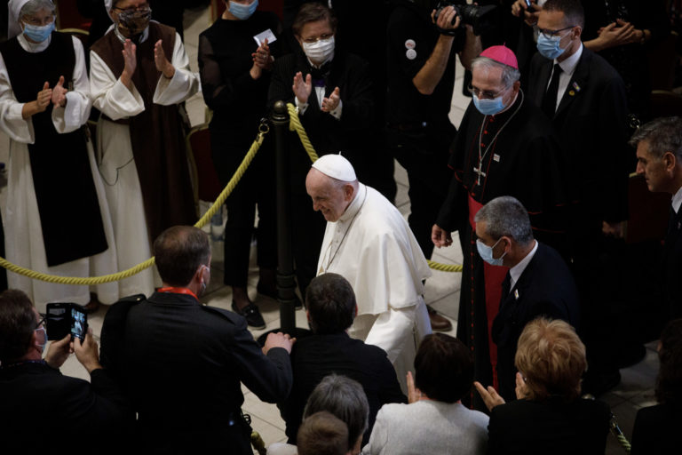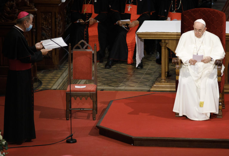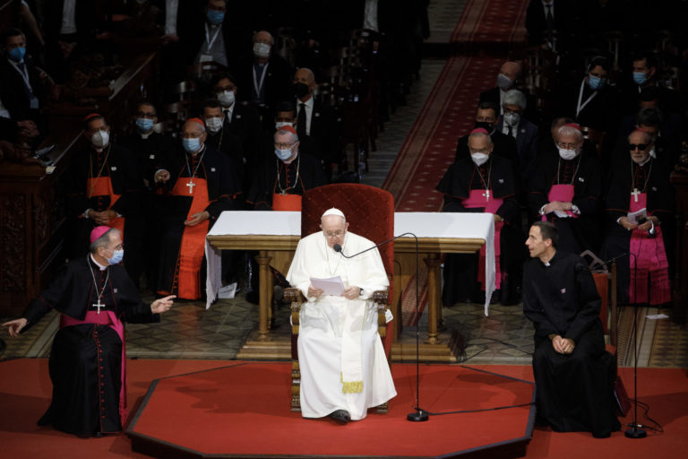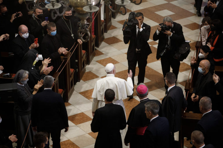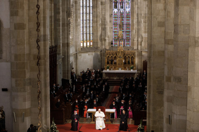 Pápež František počas stretnutia s biskupmi, kňazmi, zasvätenými osobami, seminaristami a katechétmi v Katedrále sv. Martina v Bratislave. Bratislava, 13. september 2021. Foto: SITA/AP.