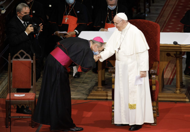Zľava v popredí: Bratislavský arcibiskup Stanislav Zvolenský a pápež František počas stretnutia Svätého Otca s biskupmi, kňazmi, zasvätenými osobami, seminaristami a katechétmi v Katedrále sv. Martina v Bratislave. Bratislava, 13. september 2021. Foto: SITA/Branislav Bibel