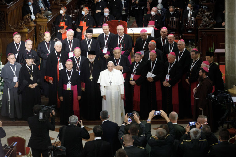 Pápež František počas stretnutia s biskupmi, kňazmi, zasvätenými osobami, seminaristami a katechétmi v Katedrále sv. Martina v Bratislave. Bratislava, 13. september 2021. Foto: SITA/Branislav Bibel