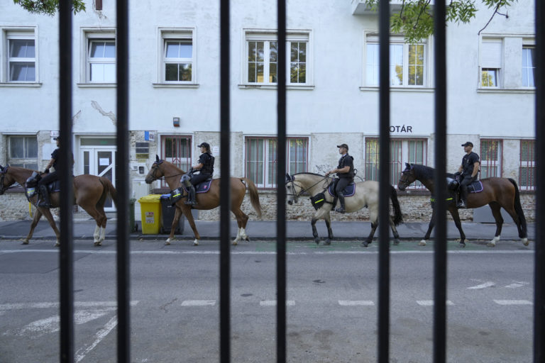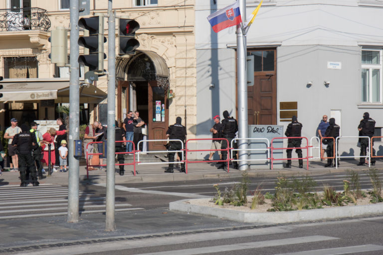 Policajné hliadky v blízkosti Prezidentského paláca počas návštevy pápeža Františka. Bratislava, 13. september 2021. Foto: SITA/AP.