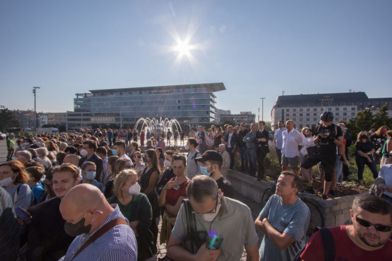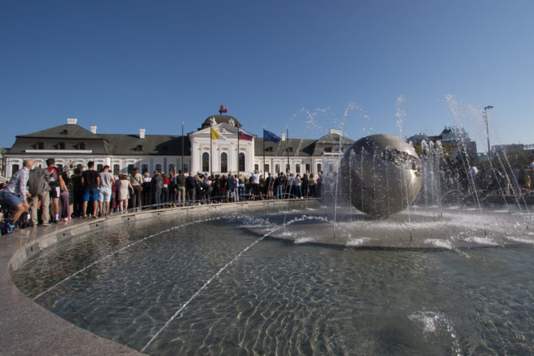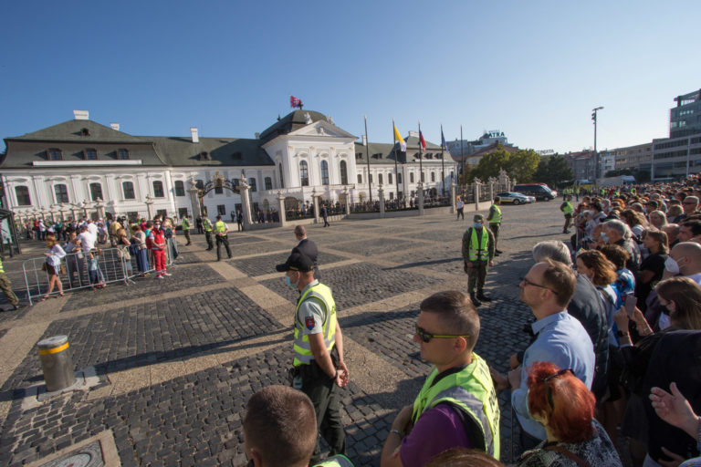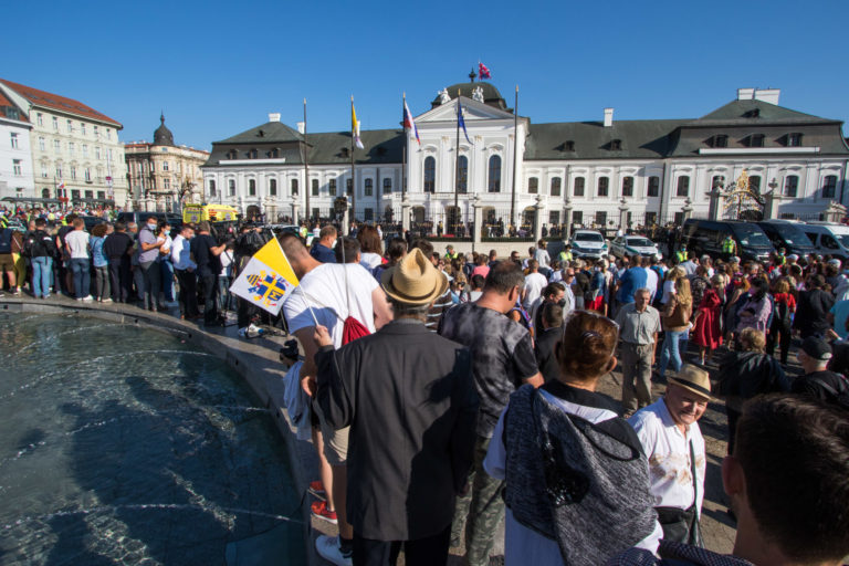Obyvatelia mesta očakávajú príjazd Svätého Otca do Prezidentského paláca. Bratislava, 13. august 2021. Foto: SITA/Ľudovít Vaniher