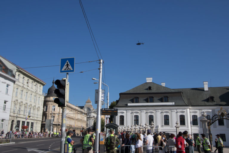 Vrtuľník (hore) kontroluje priestor počas príjazdu Svätého Otca do Prezidentského paláca. Bratislava, 13. august 2021. Foto: SITA/Ľudovít Vaniher