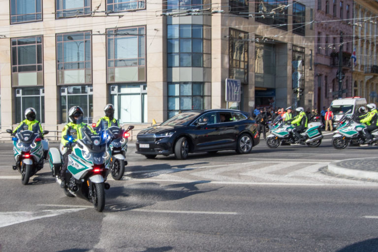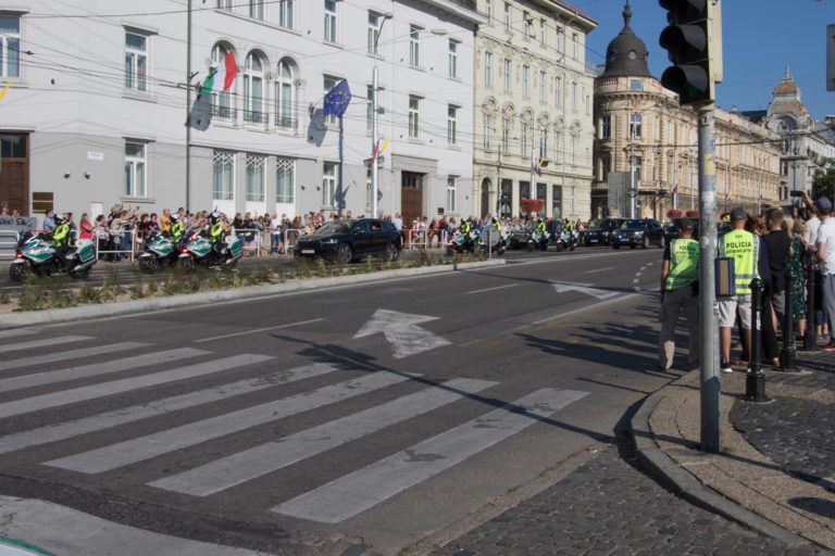 Kolóna motoriek a vozidiel počas príjazdu Svätého Otca do Prezidentského paláca. Bratislava, 13. august 2021. Foto: SITA/Ľudovít Vaniher