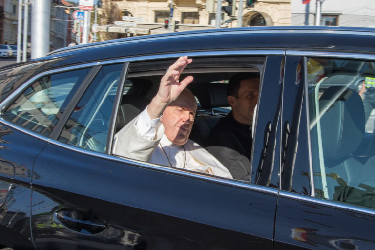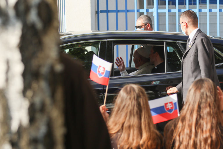 Pápež František zdraví veriacich z vozidla počas presunu na stretnutie s členmi miestnej jezuitskej komunity v Prešove. Prešov, 14. september 2021. Foto: SITA/Viktor Zamborský
