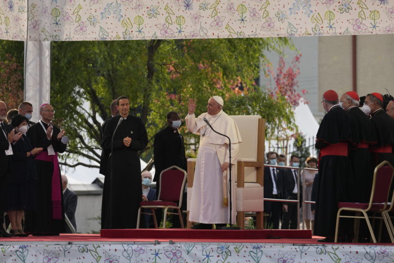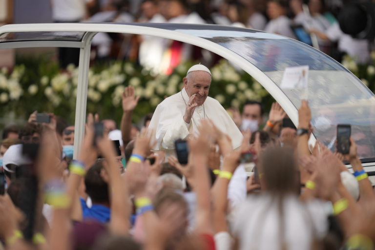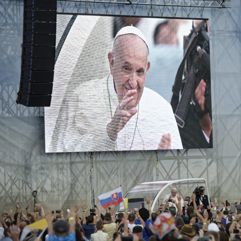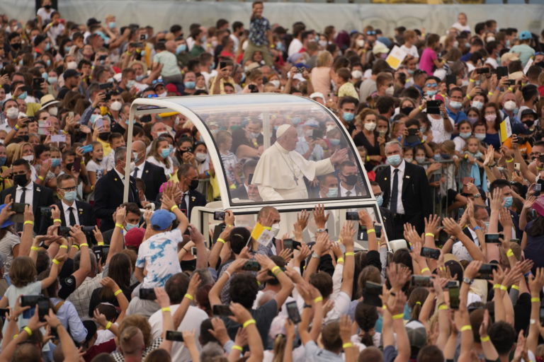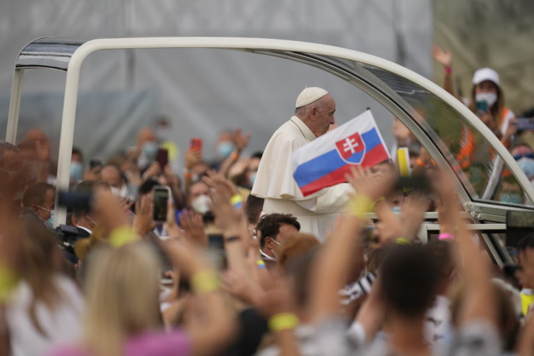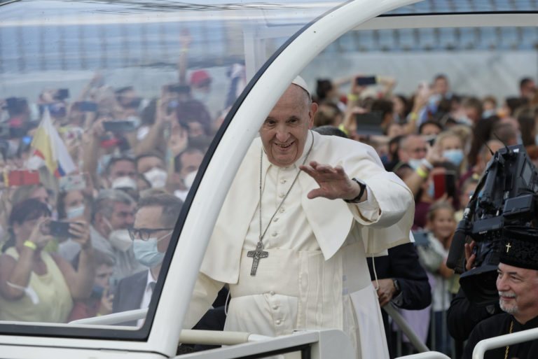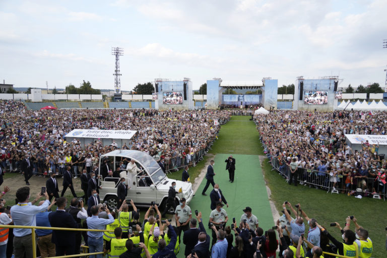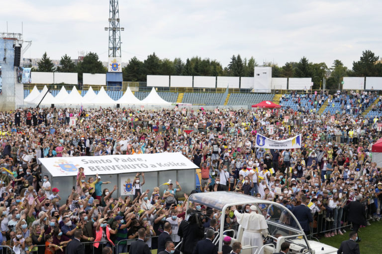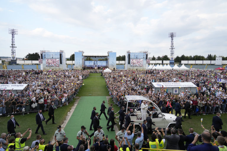 Pápež František prichádza na stretnutie s mladými na štadióne Lokomotíva. Košice, 14. september 2021. Foto: SITA/AP