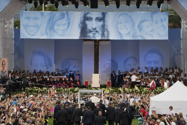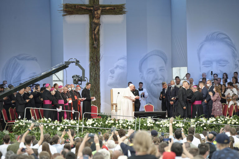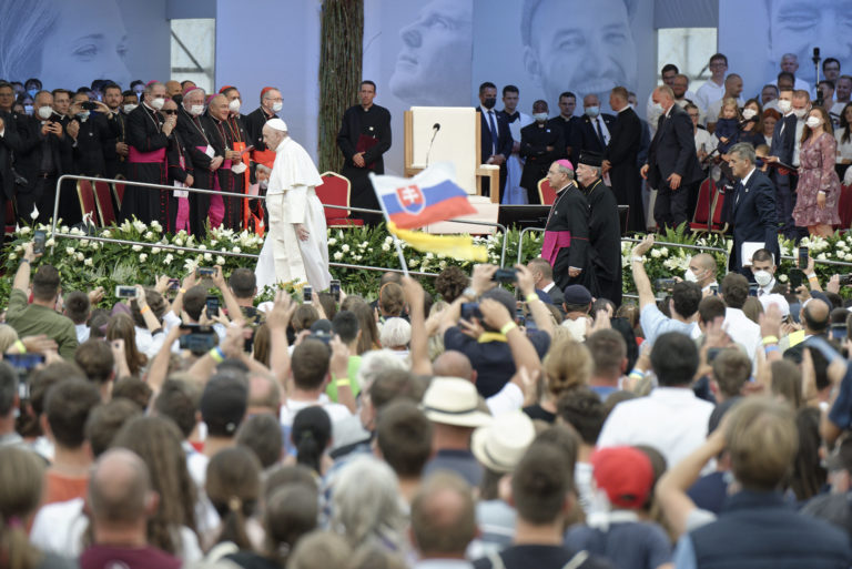 Pápež František počas stretnutia s mladými na štadióne Lokomotíva. Košice, 14. september 2021. Foto: SITA/AP