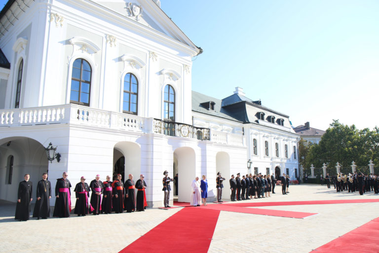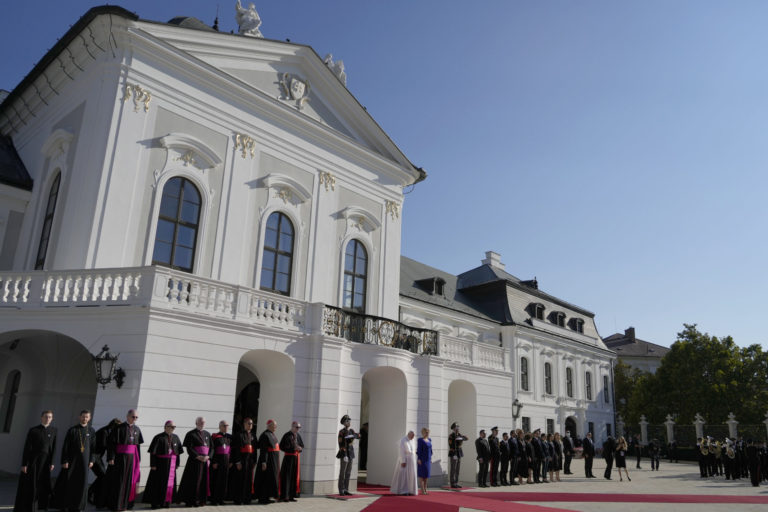 Ceremoniál v Prezidentskom paláci počas prijatia pápeža Františka prezidentkou Zuzanou Čaputovou. Bratislava, 13. september 2021. Foto: SITA/AP.
