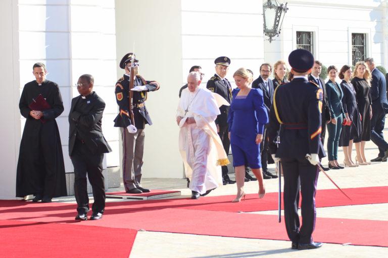 Pápež František počas privítacieho ceremoniálu na nádvorí Prezidentského paláca. Bratislava, 13. august 2021. Foto: SITA/Ľudovít Vaniher