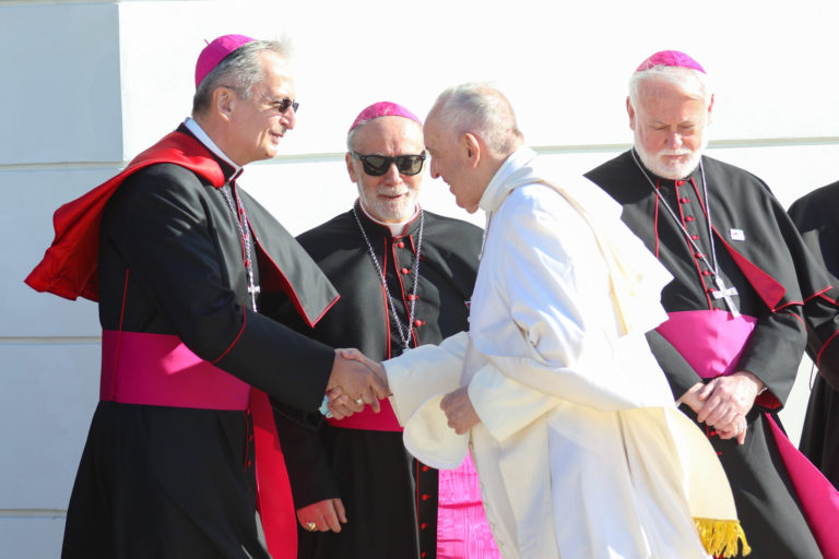 Prešovský arcibiskup a mettropolita Ján Babjak (uprostred) pred Mestskou športovou halou v Prešove pred príchodom pápeža Františka. Prešov, 14. september 2021. Foto: SITA/Viktor Zamborský