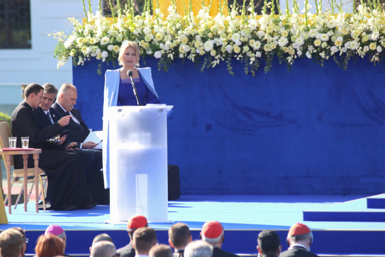 Príhovor Zuzany Čaputovej v záhrade Prezidentského paláca počas návštevy pápeža Františka. Bratislava, 13. september 2021. Foto: SITA/AP.