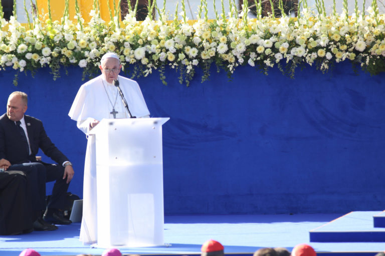 Pápež František počas slávnostnej svätej omše na otvorenom priestranstve pri Národnej svätyni v Šaštíne pri príležitosti celonárodnej púte k Sedembolestnej Panne Márii. aštín-Stráže, 15. september 2021. Foto: SITA/Martin Medňanský