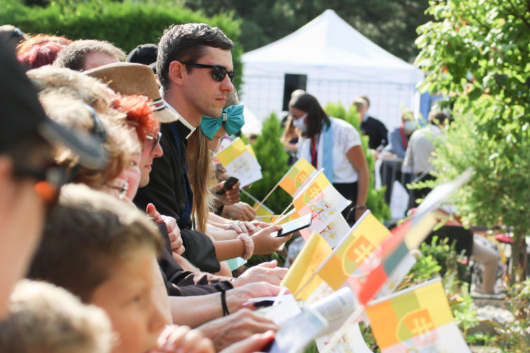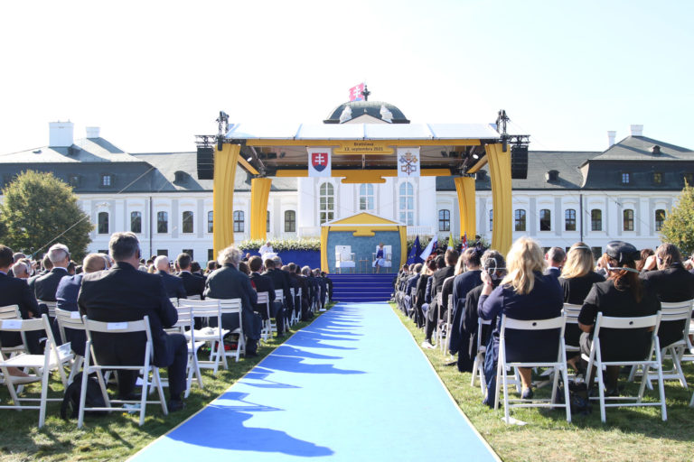 Atmosféra počas stretnutia Svätého Otca s predstaviteľmi štátu, občianskej spoločnosti a diplomatického zboru v záhrade Prezidentského paláca. Bratislava, 13. september 2021. Foto: SITA/Alexandra Čunderlíková