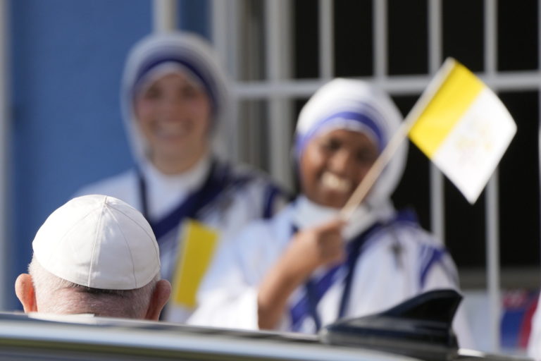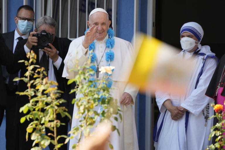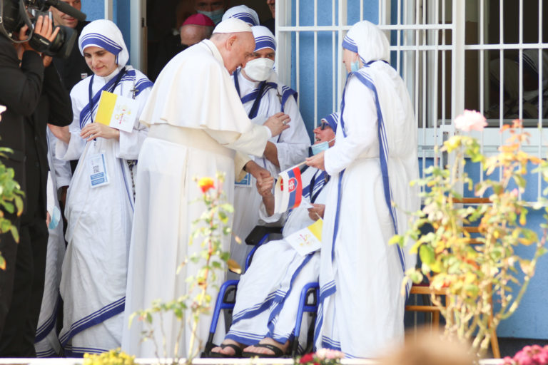 Sestry Matky Terezy vítajú pápeža Františka počas jeho návštevy centra Betlehem, ktoré sa stará o bezdomovcov a opustených. Bratislava, 13. september 2021. Foto: SITA/AP.