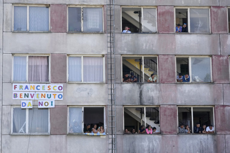 Obyvatelia sídliska Luník IX. vítajú pápeža Františka. Košice, 14. september 2021. Foto: SITA/AP.