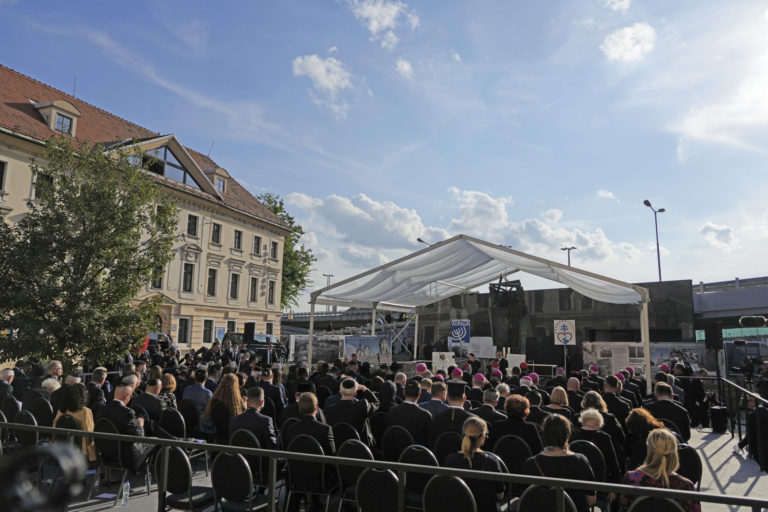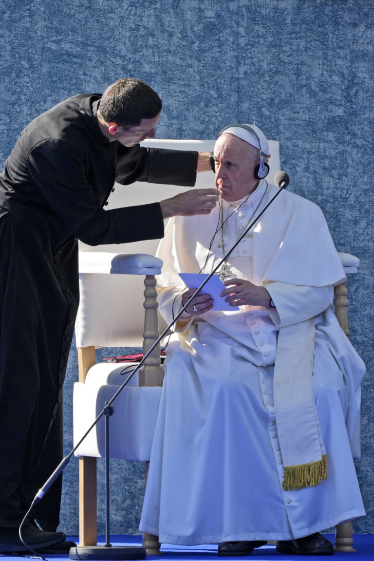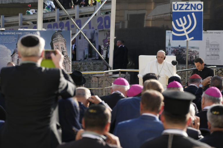 Pápež František počas stretnutia so židovskou komunitou na Rybnom námestí. Bratislava, 13. september 2021. Foto: SITA/AP.