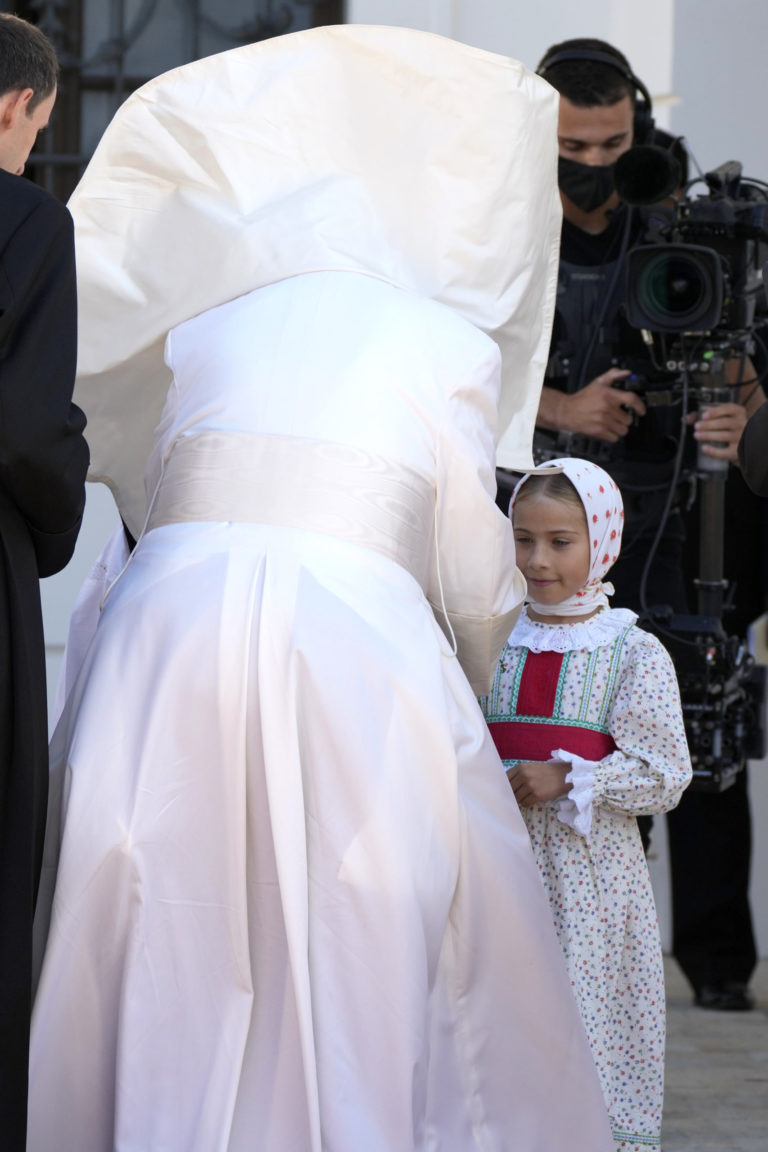Pápež František prichádza na otvorené priestranstvo pri Národnej svätyni v Šaštíne, kde odslúži pri príležitosti celonárodnej púte k Sedembolestnej Panne Márii slávnostnú svätú omšu. Šaštín - Stráže 15. september 2021. Foto: SITA/AP.