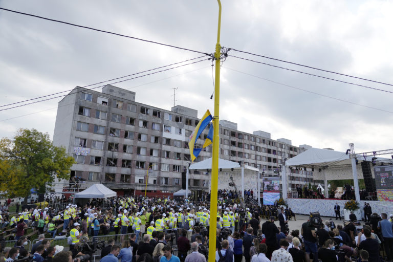 Atmosféra v priestore pred Mestskou športovou halou v Prešove, kde bude celebrovať pápež František archijerejskú svätú liturgiu. Prešov, 14. september 2021. Foto: SITA/Viktor Zamborský