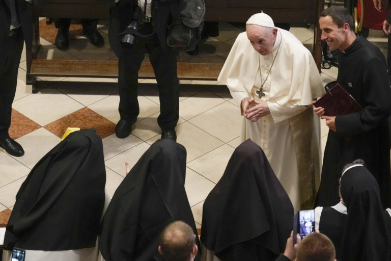 Atmosféra medzi mníškami počas homílie v rámci slávnostnej svätej omše, ktorú slúži pápež František na otvorenom priestranstve pri Národnej svätyni v Šaštíne pri príležitosti celonárodnej púte k Sedembolestnej Panne Márii. Šaštín-Stráže, 15. september 2021. Foto: SITA/AP