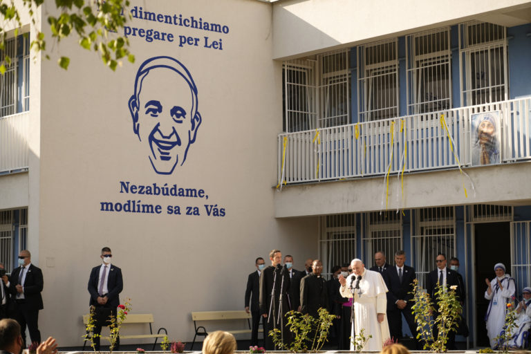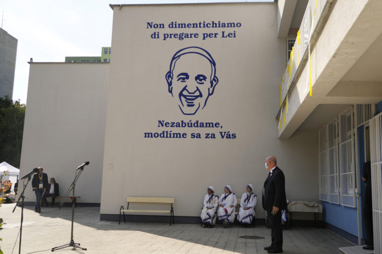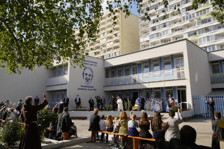 Pápeža Františka vítajú v centre Betlehem, ktoré sa stará o bezdomovcov a opustených. Bratislava, 13. september 2021. Foto: SITA/AP.