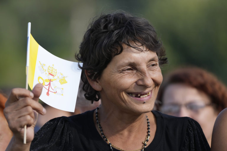 Obyvateľka sídliska Luník IX počas píchodu pápeža Františka. Košice, 14. september 2021. Foto: SITA/AP.