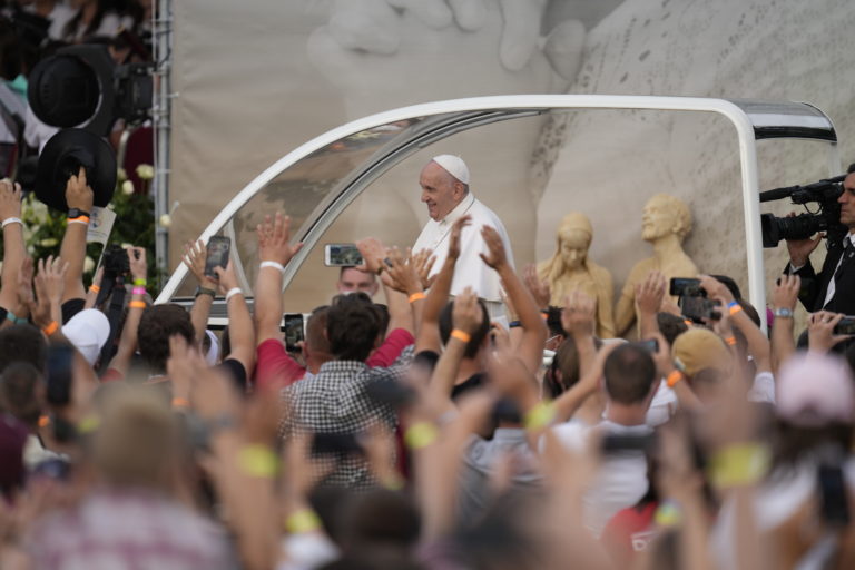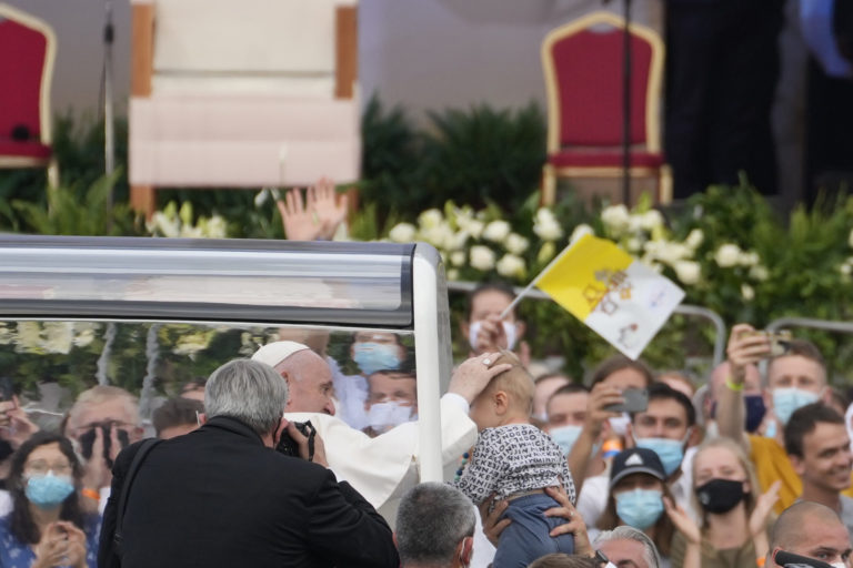 Pápež František zdraví veriacich z papamobilu na otvorenom priestranstve pri Národnej svätyni v Šaštíne pred svätou omšou pri príležitosti celonárodnej púte k Sedembolestnej Panne Márii. Šaštín-Stráže, 15. september 2021. Foto: SITA/Martin Medňanský