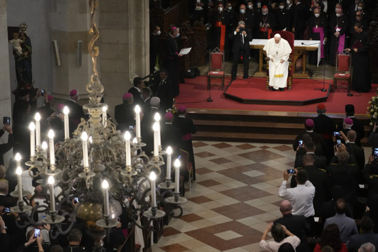 Pápež František počas stretnutia s biskupmi, kňazmi, zasvätenými osobami, seminaristami a katechétmi v Katedrále sv. Martina v Bratislave. Bratislava, 13. september 2021. Foto: SITA/AP