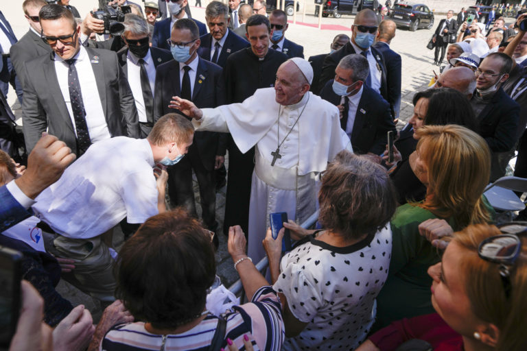 Pápež František sa víta s obyvateľmi mesta počas návštevy Katedrály sv. Martina. Bratislava, 13. september 2021. Foto: SITA/AP.