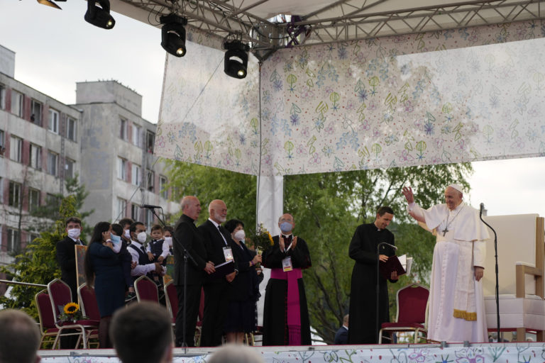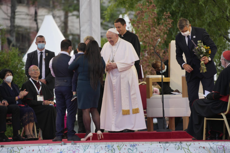 Pápež František počas stretnutia s rómskou komunitou na priestranstve pred saleziánskym komunitným centrom na sídlisku Luník IX. Košice, 14. september 2021. Foto: SITA/AP.
