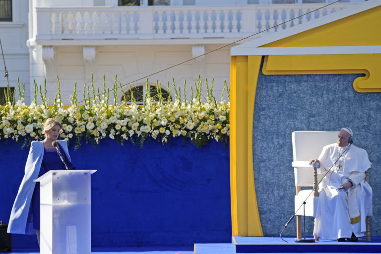 Pápež František počas príhovoru prezidentky Zuzany Čaputovej v záhrade Prezidentského paláca. Bratislava, 13. september 2021. Foto: SITA/AP.