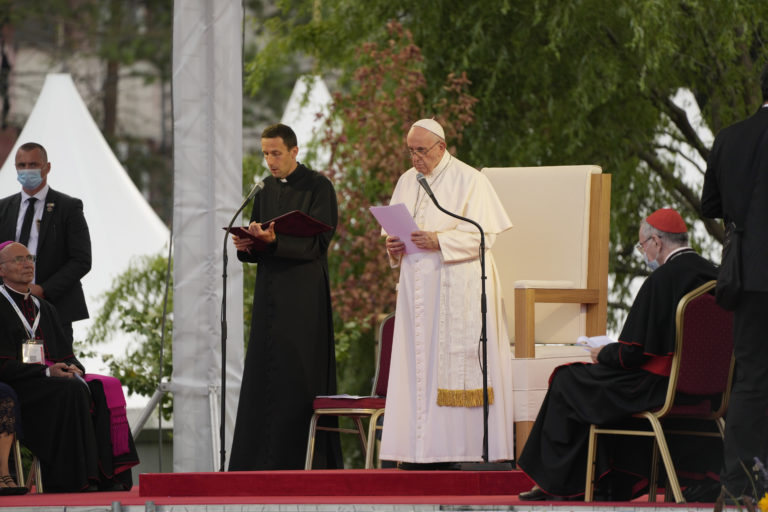 Pápež Františej počas slávnostnej svätej omše na otvorenom priestranstve pri Národnej svätyni v Šaštíne pri príležitosti celonárodnej púte k Sedembolestnej Panne Márii. Šaštín-Stráže, 15. september 2021. Foto: SITA/AP