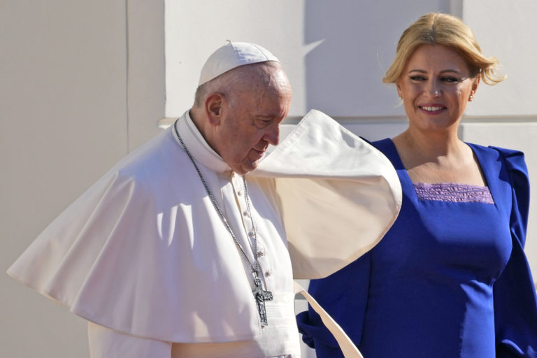 Pápež František a prezidentka Zuzana Čaputová počas stretnutie v Prezidentskom paláci. Bratislava, 13. september 2021. Foto: SITA/AP.