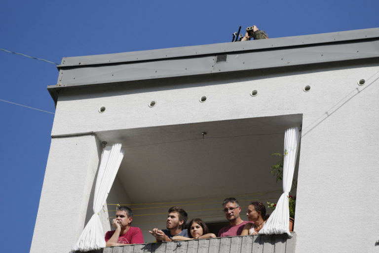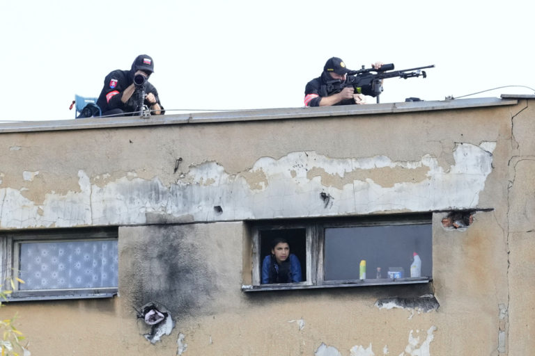 Ostreľovači kontrolujú situáciu na sídlisku Luník IX, ktoré navštívi pápež František. Košice, 14. september 2021. Foto: SITA/AP.