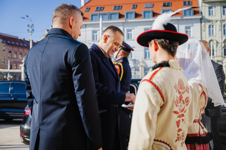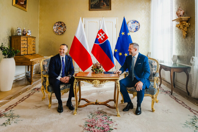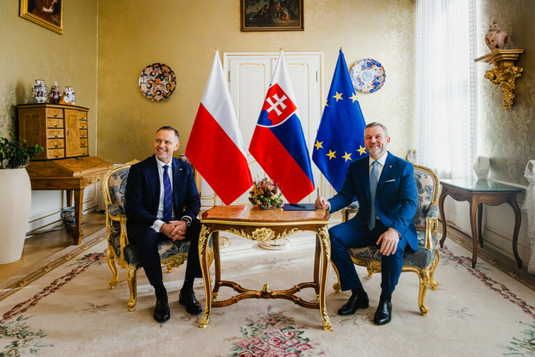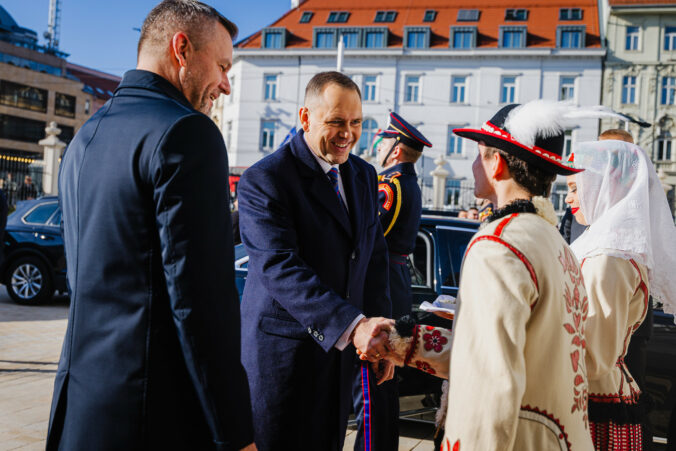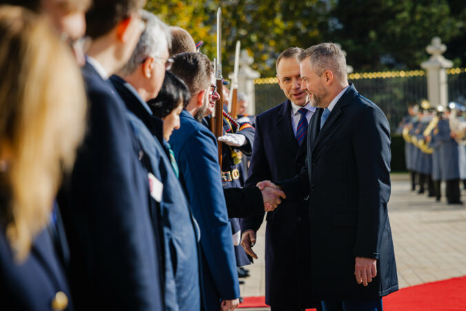 Sprava: Prezident SR Peter Pellegrini a prezident Poľska Karol Nawrocki počas prijatia v Prezidentskom paláci. Bratislava, 5. november 2025. Foto: SITA/Kancelária prezidenta