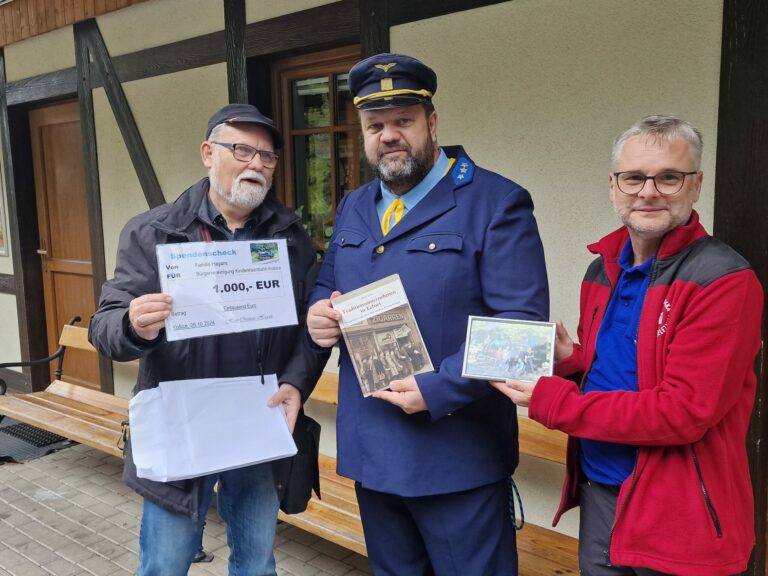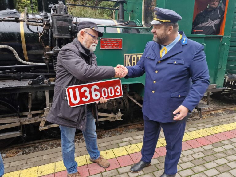 Vľavo Hans Christian Hagans, pravnuk konštruktéra a majiteľa nemeckej továrne Hagans Erfurt, kde v roku 1884 vyrobili parnú lokomotívu Katka, pri preberaní daru od riaditeľa Košickej detskej historickej železnice Ľubomírom Lehotským. Košice, 5. októbra 2024. Foto: SITA/Ivan Kriššák