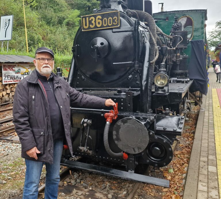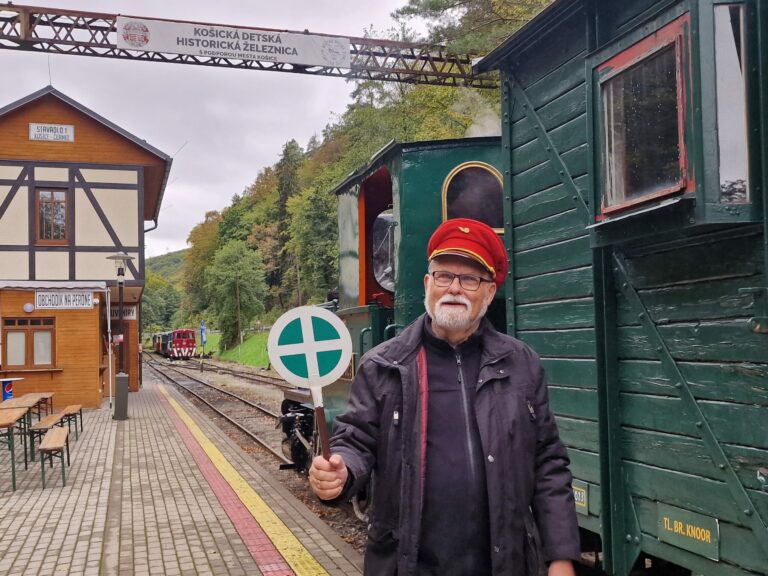 Hans Christian Hagans, pravnuk konštruktéra a majiteľa nemeckej továrne Hagans Erfurt, kde v roku 1884 vyrobili parnú lokomotívu Katka, pri návšteve Košickej detskej historickej železnice. Košice, 5. októbra 2024. Foto: SITA/Ivan Kriššák