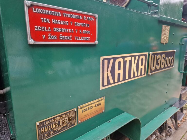 Pamätná tabuľa umiestnená na historickej lokomotíve Katka pri príležitosti návštevy Hansa Christiana Hagansa, pravnuka konštruktéra a majiteľa nemeckej továrne Hagans Erfurt, kde v roku 1884 parnú lokomotívu vyrobili. Košice, 5. októbra 2024. Foto: SITA/Ivan Kriššák