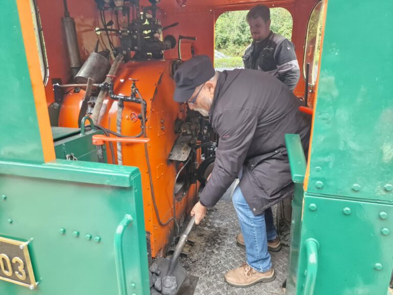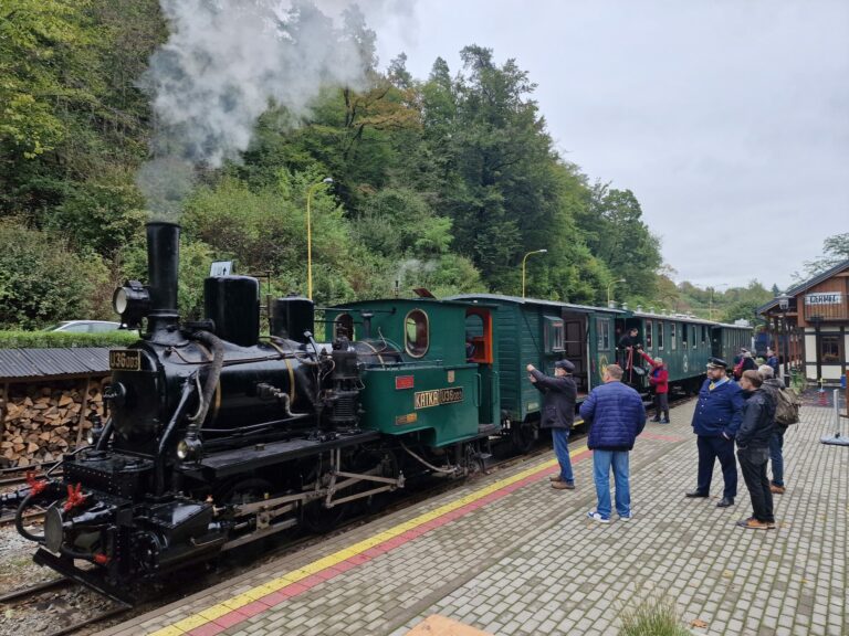Historickú parnú lokomotívu U36 003 - Katka, navštívil Hans Christian Hagans, vnuk konštruktéra a majiteľa nemeckej továrne Hagans Erfurt, kde ju v roku 1884 vyrobili. Košice, 5. októbra 2024. Foto: SITA/Ivan Kriššák