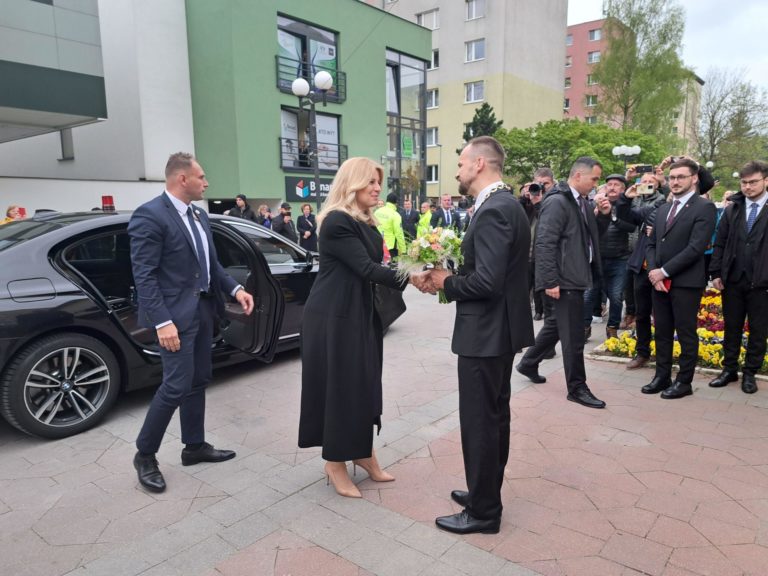 Primátor Starej Ľubovne Ľuboš Tomko (v popredí vpravo) a prezidentka Zuzana Čaputovúá pred mestským úradom na začiatku jej návštevy mesta v rámci tohtotýždňového úradovania na východnom Slovensku. Stará Ľubovňa, 24. apríl 2024. Foto: SITA/Mária Frisová