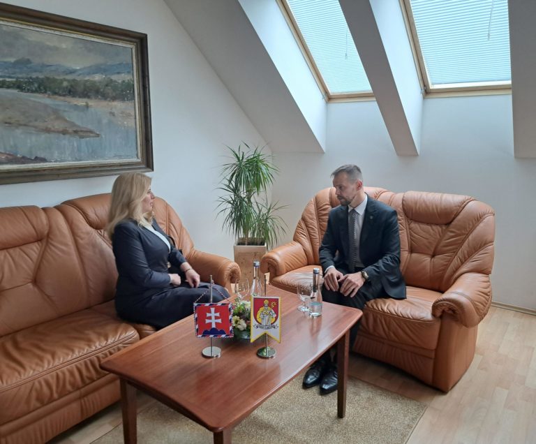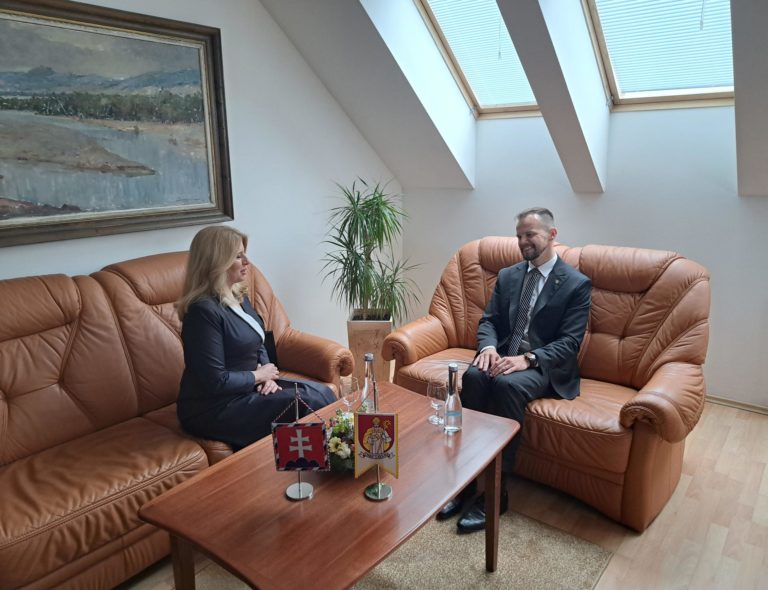 Prezidentka Zuzana Čaputová a primátor Starej Ľubovne Ľuboš Tomko počas stretnutia na mestskom úrade pri príležitosti návštevy mesta v rámci tohtotýždňového úradovania na východnom Slovensku. Stará Ľubovňa, 24. apríl 2024. Foto: SITA/Mária Frisová