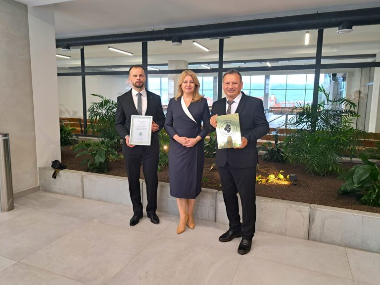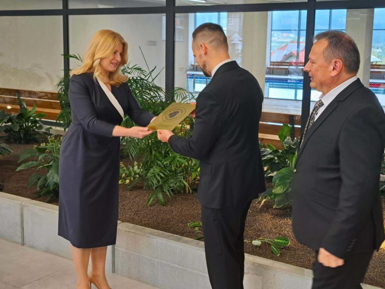 Zľava: Primátor Starej Ľubovne Ľuboš Tomko, prezidentka Zuzana Čaputová a riaditeľ spoločnosti spravujúcej mestskú plaváreň Milan Malast po prijatí Zelenej prezidentskej pečate za rekonštrukciu plavárne pri príležitosti návštevy prezidentky v meste v rámci tohtotýždňového úradovania na východnom Slovensku. Stará Ľubovňa, 24. apríl 2024. Foto: SITA/Mária Frisová