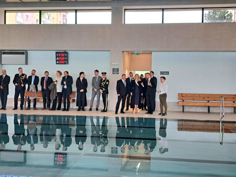 Prezidentka Zuzana Čaputová (v popredí tretia sprava) počas prehliadky priestorov zrekonštruovanej mestskej plavárne v Starej Ľubovni pri príležitosti návštevy mesta v rámci tohtotýždňového úradovania na východnom Slovensku. Stará Ľubovňa, 24. apríl 2024. Foto: SITA/Mária Frisová