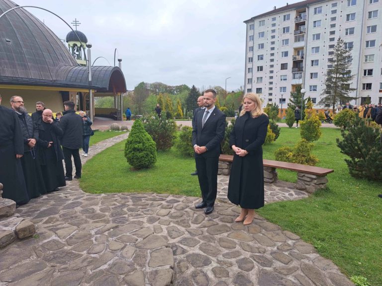 Sprava: Prezidentka Zuzana Čaputová a primátor mesta Stará Ľubovňa Ľuboš Tomko počas pietnej spomienky pri grécko-katolíckom Chráme Matky ustavičnej pomoci v Starej Ľubovni na obete nedávnej dopravnej nehody pri Spišskom Podhradí. Stará Ľubovňa, 24. apríl 2024. Foto: SITA/Mária Frisová
