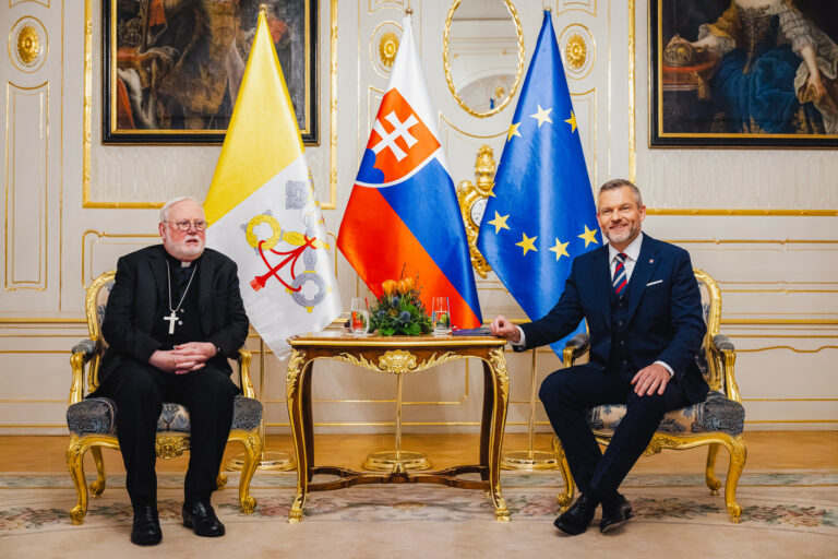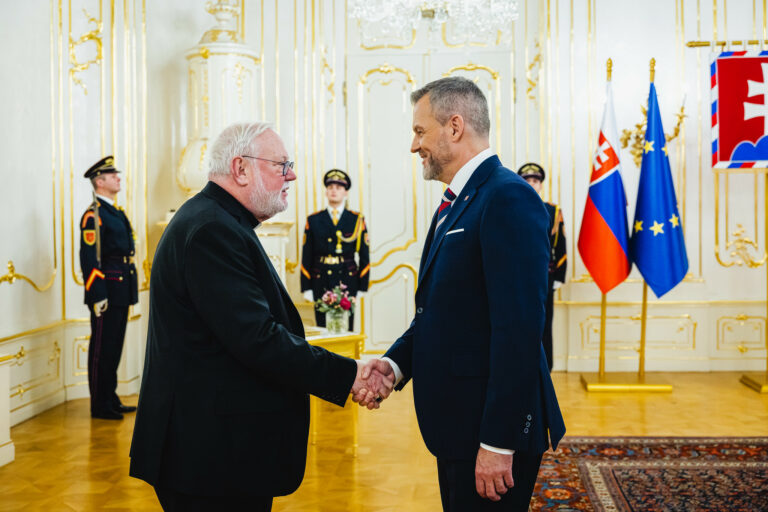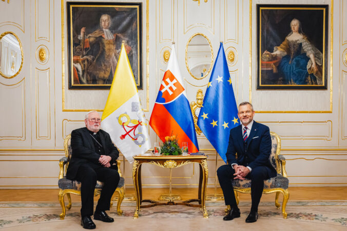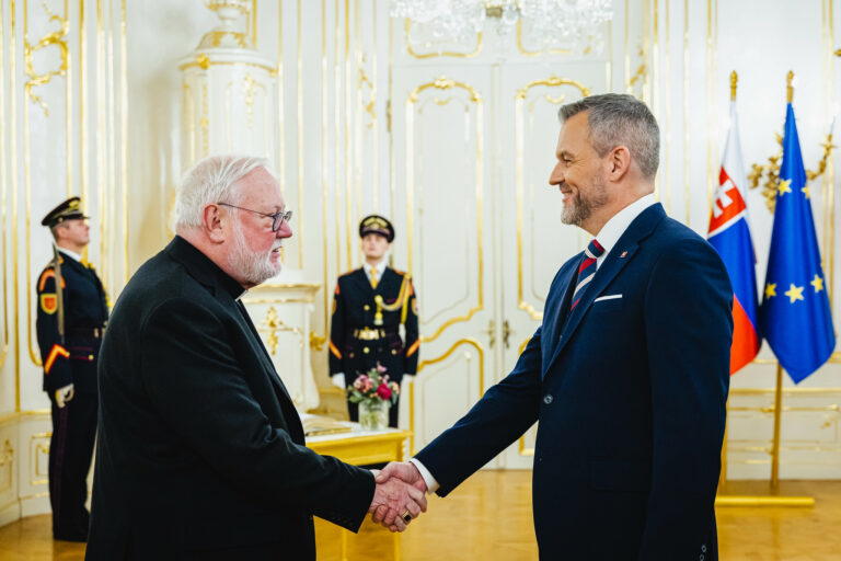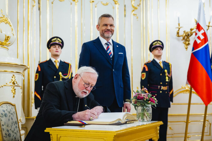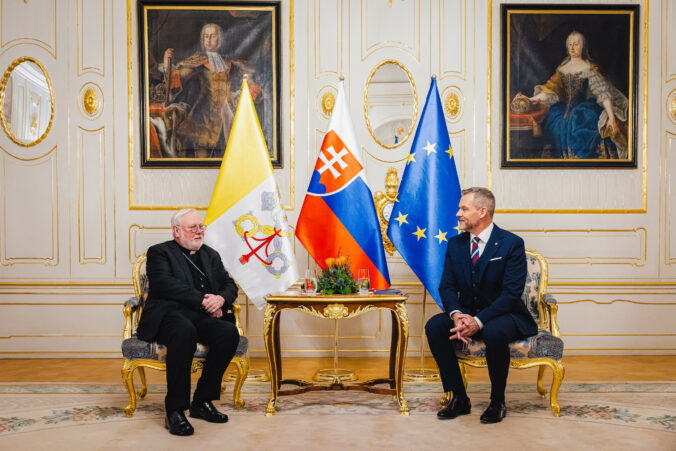 Sprava: Prezident SR Peter Pellegrini a sekretár pre vzťahy so štátmi a medzinárodnými organizáciami Štátneho sekretariátu Svätej stolice Mons. Paul Richard Gallagher počas prijatia v Prezidentskom paláci. Bratislava, 30. január 2026. Foto: SITA/Kancelária prezidenta SR