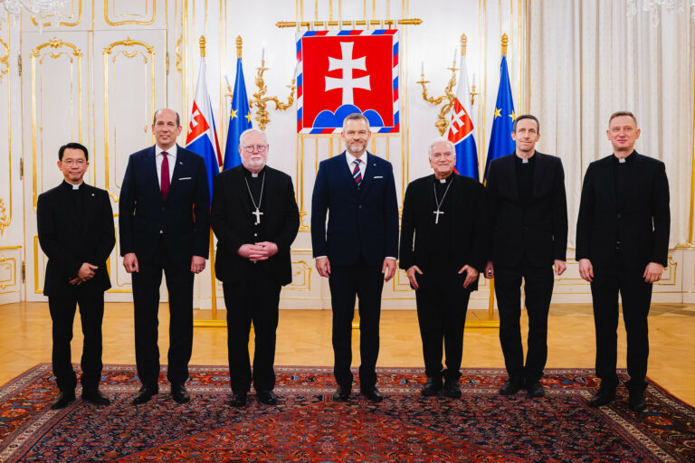 Prezident SR Peter Pellegrini (uprostred) a sekretár pre vzťahy so štátmi a medzinárodnými organizáciami Štátneho sekretariátu Svätej stolice Mons. Paul Richard Gallagher (tretí zľava) počas prijatia v Prezidentskom paláci. Bratislava, 30. január 2026. Foto: SITA/Kancelária prezidenta SR