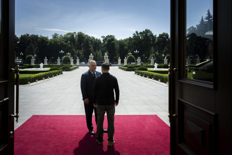 Maďarský premiér Viktor Orbán a ukrajinský prezident Volodymyr Zelenskyj počas ich rokovania v Kyjeve. Kyjev, 2. júl 2024. Foto: Zoltan Fischer/Hungarian PM's Press Office/MTI via AP