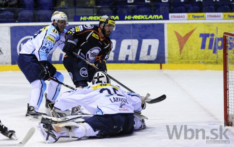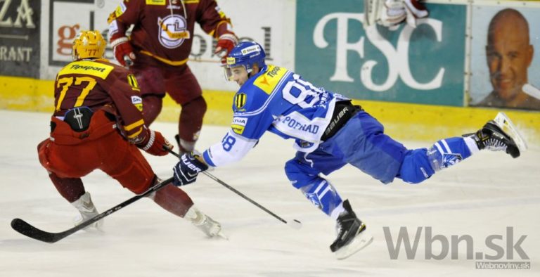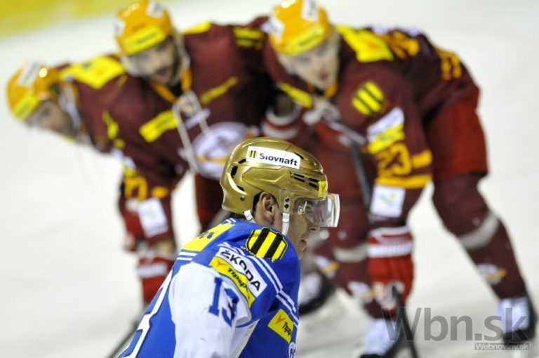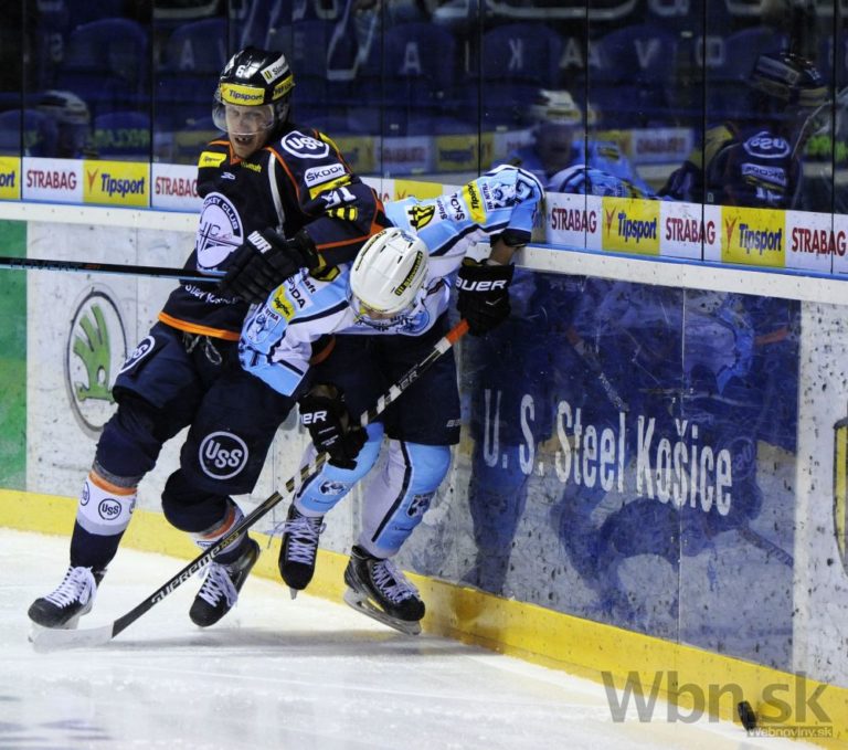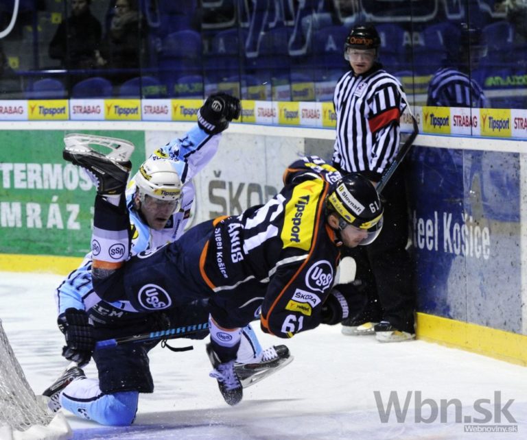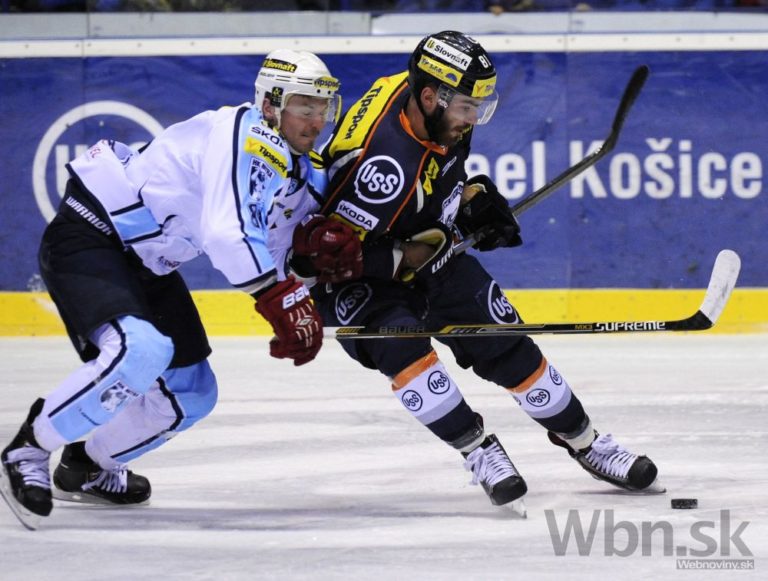 Zľava: Marek Bartánus z Košíc a Michal Novák z Nitry v zápase 31. kola hokejovej Tipsport extraligy medzi HC Košice - HK Nitra. Košice, 7. december 2014. Foto: SITA/Tibor Zmak