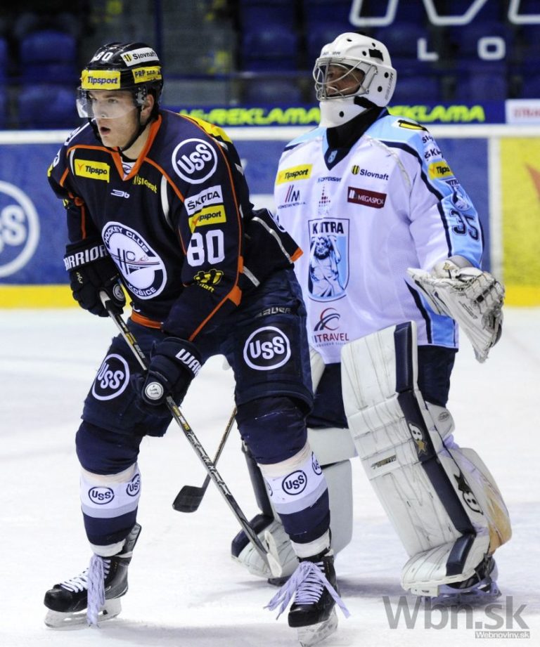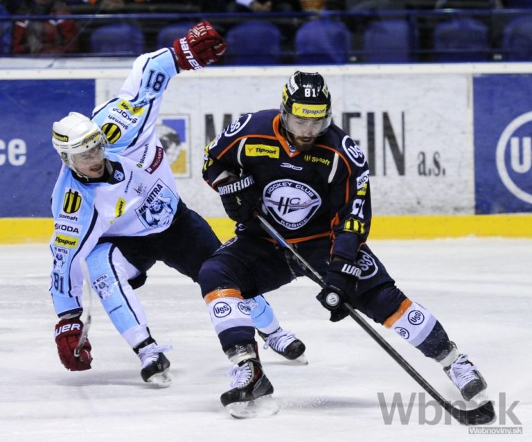 Zľava: Erik Bednár z Nitry a Adam Lapšanský z Košíc v zápase 31. kola hokejovej Tipsport extraligy medzi HC Košice - HK Nitra. Košice, 7. december 2014. Foto: SITA/Tibor Zmak